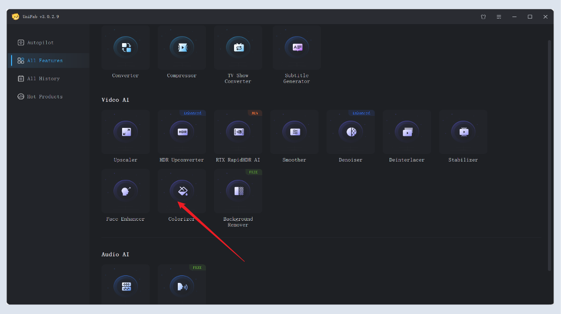 Open the UniFab application, navigate to "All Features", and choose the “Colorizer” module. Click the “+” button or drag and drop your black-and-white video to import it into the workspace.