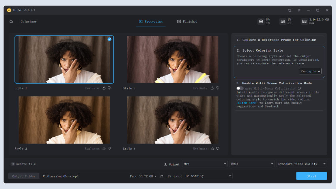 Click the “Capture” button and drag the progress bar to select key reference frames in the video. Then click “Generate.” UniFab will automatically produce four unique AI color styles based on the selected frame. Preview and choose the style that best fits your needs.